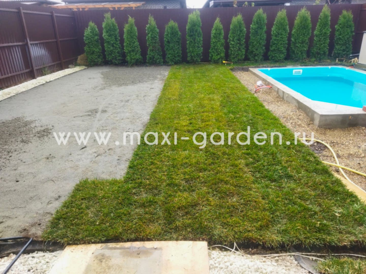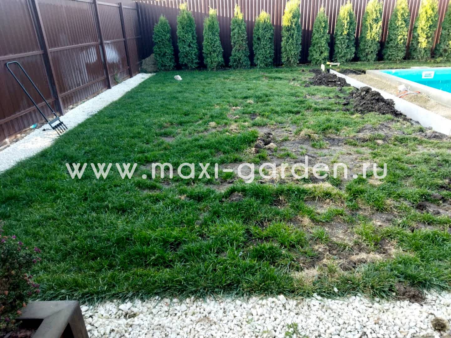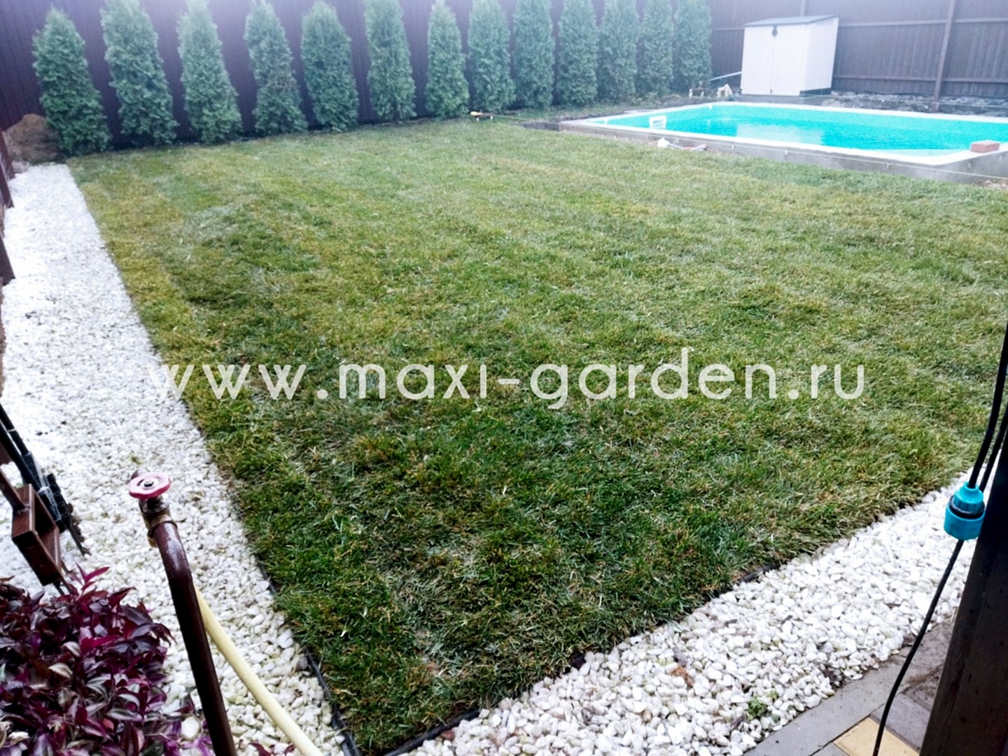 Снятие старого газона, укладка Pin-Up газона у бассейна, ревизия системы автоматического полива